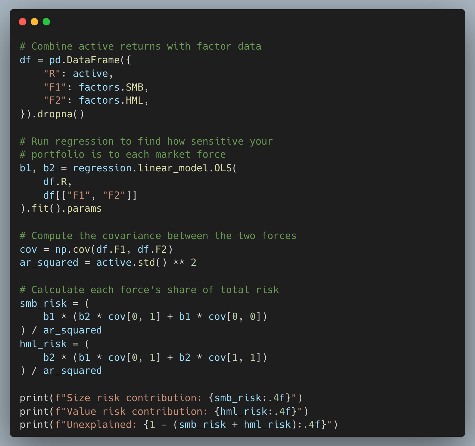 This code takes your portfolio’s returns (after subtracting a benchmark like SPY) and measures how much of the remaining risk comes from two well-known market forces.