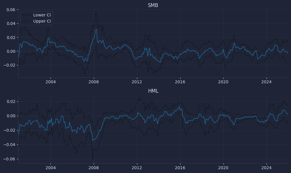 This assumes `factors` is a DataFrame with columns "SMB" and "HML" from the Fama-French dataset, and `active` is a pandas Series of your portfolio's monthly returns minus a benchmark like SPY.