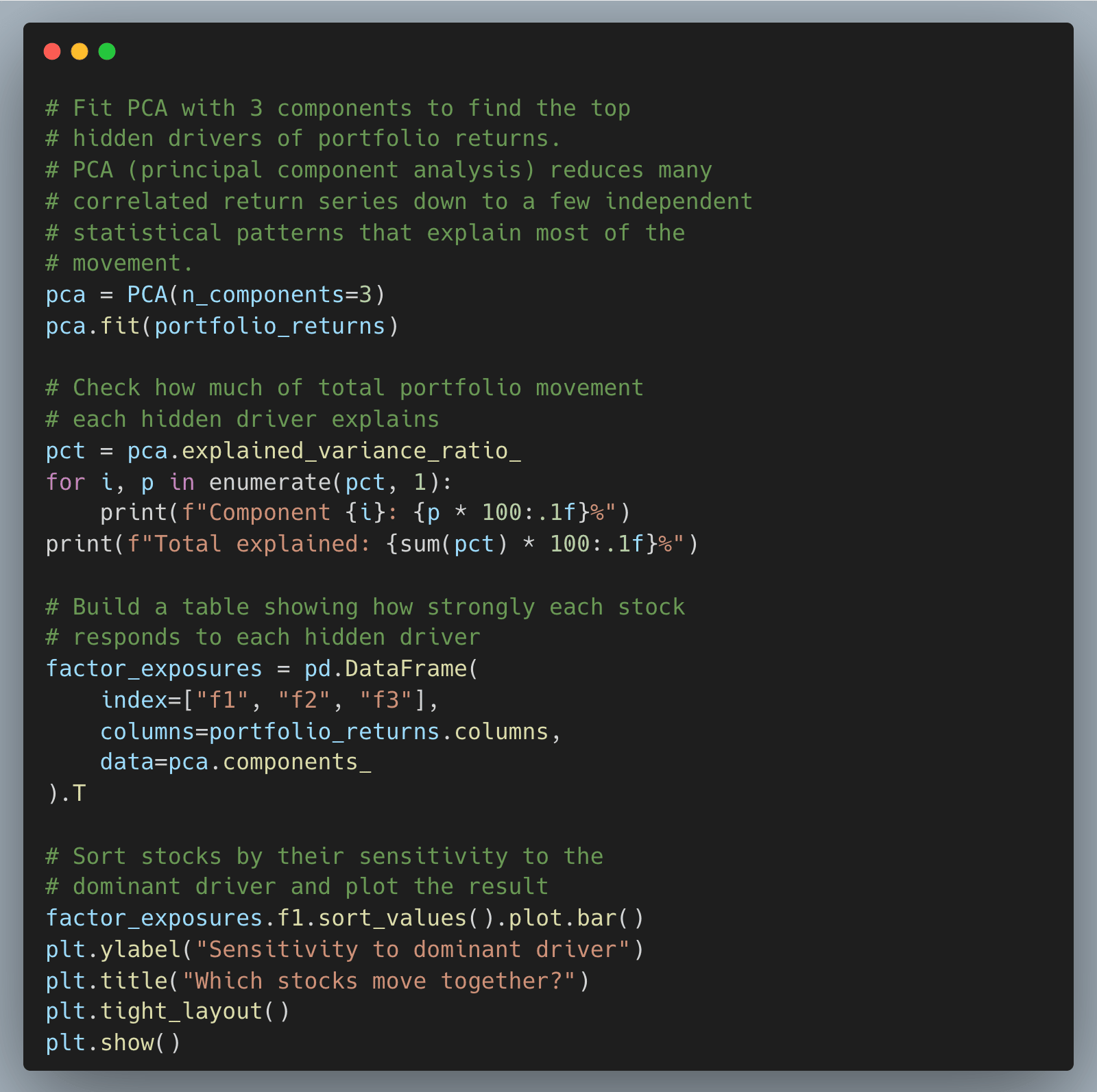 This code takes your portfolioβs daily returns and finds the few hidden statistical patterns that explain most of the movement.