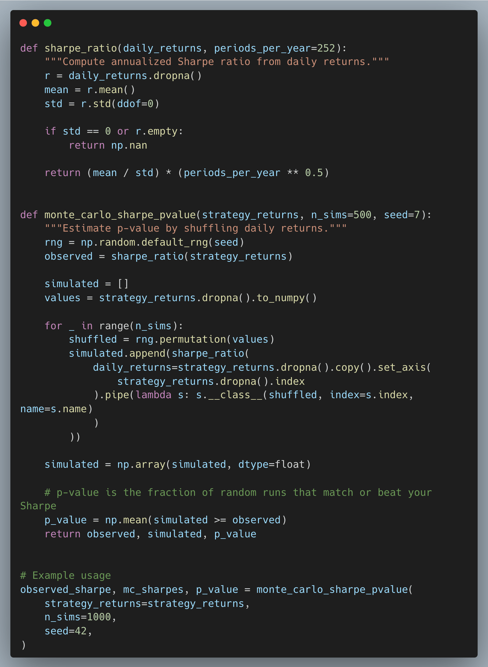 Backtests look “proven” until you measure luck (then you can stop optimizing noise)You’re not alone if you run a backtest, see a decent Sharpe, and then feel stuck because you don’t know whether it reflects skill or a lucky window. Without a simple sanity check, it’s easy to spend nights tweaking lookbacks and filters that only work in-sample. Then you change the date range and the performance falls apart. Here’s the reality: Professional research teams treat a single backtest as one draw from a distribution, not as evidence of an edge. If you test enough variations of the same idea, you will eventually find a “good” Sharpe by chance, even when the strategy has no real signal. If you want to build, backtest, and deploy Python-based algorithmic trading strategies, you need one habit early. You should measure how often your backtest result shows up when the price path loses its real structure, while your rules stay unchanged. Here's a Python example you can use now. Assumes you already have `strategy_returns` as a pandas Series of daily returns, and you have `np` available. This gives you three things: